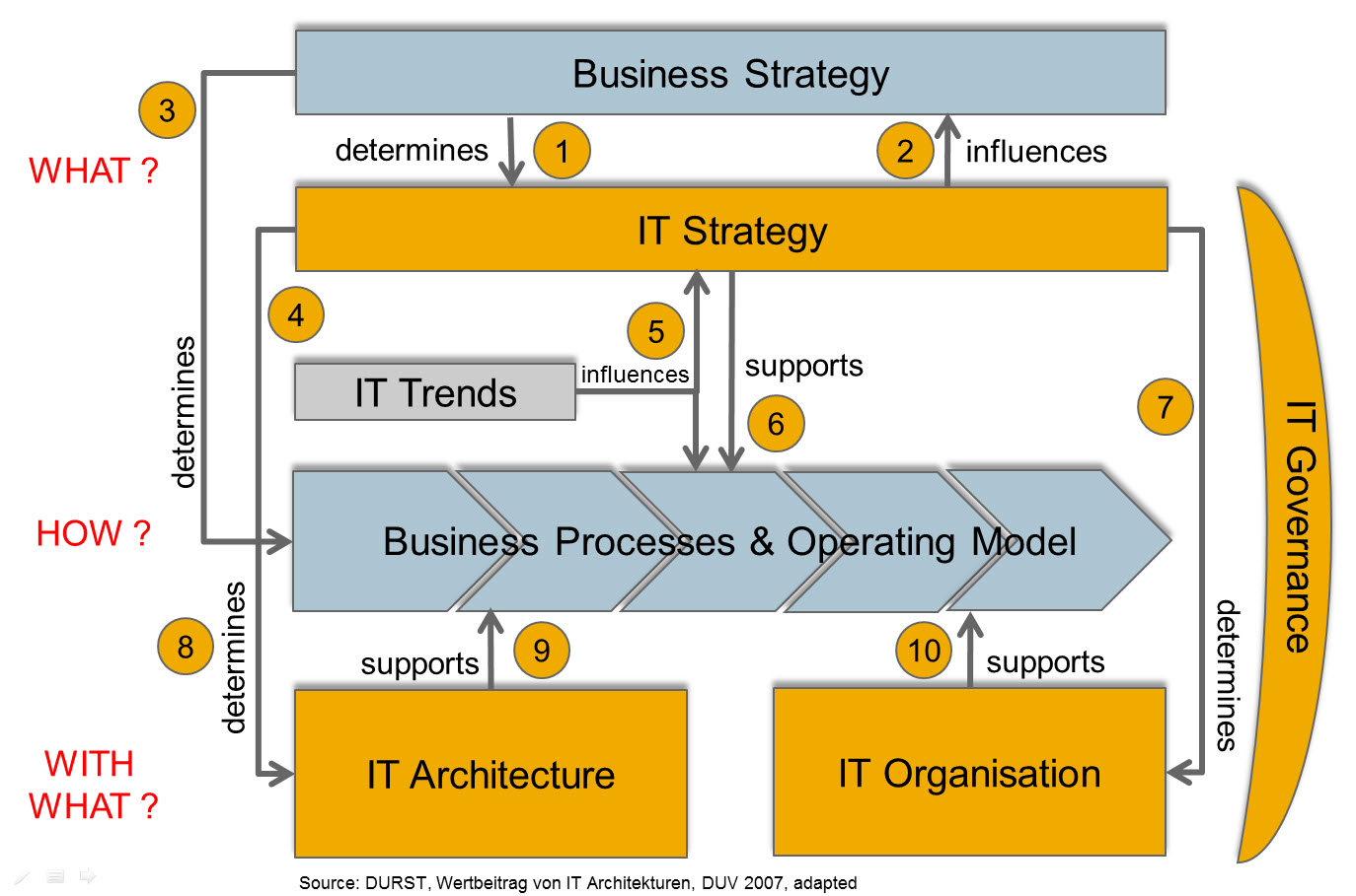 Eine gute IT Strategie zeichnet sich vor allem dadurch aus, dass sie sich aus der Strategie und den Anforderungen des Geschäfts ableitet. Wichtig dafür ist es dass die IT einen regelmäßigen Kommunikationsprozess mit dem Geschäft etabliert um sicherzustellen, dass sie die richtigen Schlussfolgerungen aus der Strategie des Geschäfts zieht und IT dem Business verständlich präsentiert wird. Die IT positioniert sich dadurch als Partner des Geschäfts und kann sogar umgekehrt durch das Aufzeigen neuer technologischer Möglichkeiten Einfluss auf die Strategie des Geschäfts nehmen.
